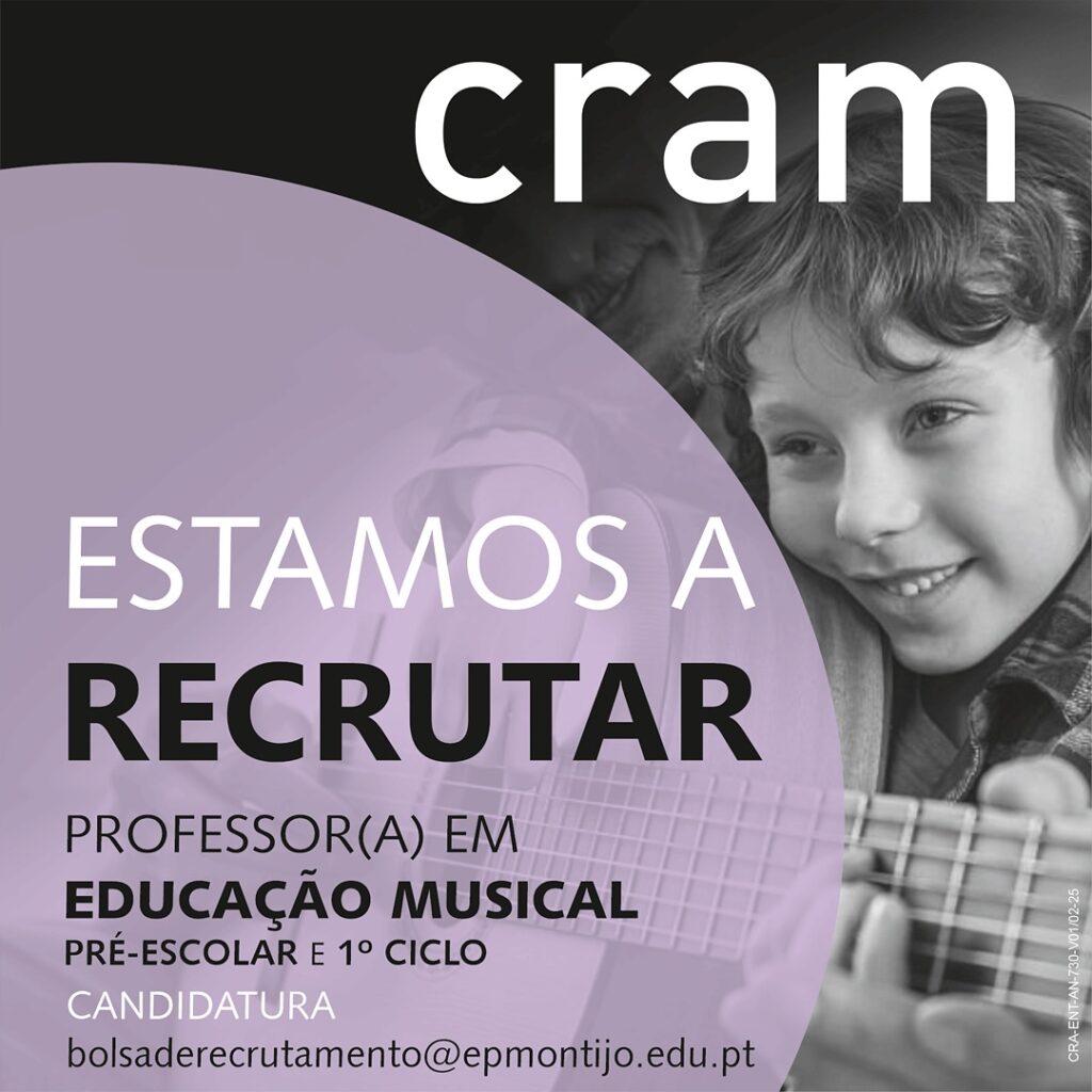 O CRAM está a recrutar Professor(a) de Educação Musical para Pré-Escolar e 1.º Ciclo! Se tens paixão pela música, formação adequada e vontade de inspirar os mais pequenos, envia já a tua candidatura para bolsaderecrutamento@epmontijo.edu.pt. Vem fazer parte de uma equipa dedicada a despertar o talento musical das nossas crianças!